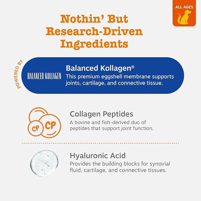 - Featuring Balanced Kollagen - At 150 mg per chew, Balanced Kollagen is a premium form of eggshell membrane that helps maintain healthy joints, cartilage, and connective tissues for your dog.