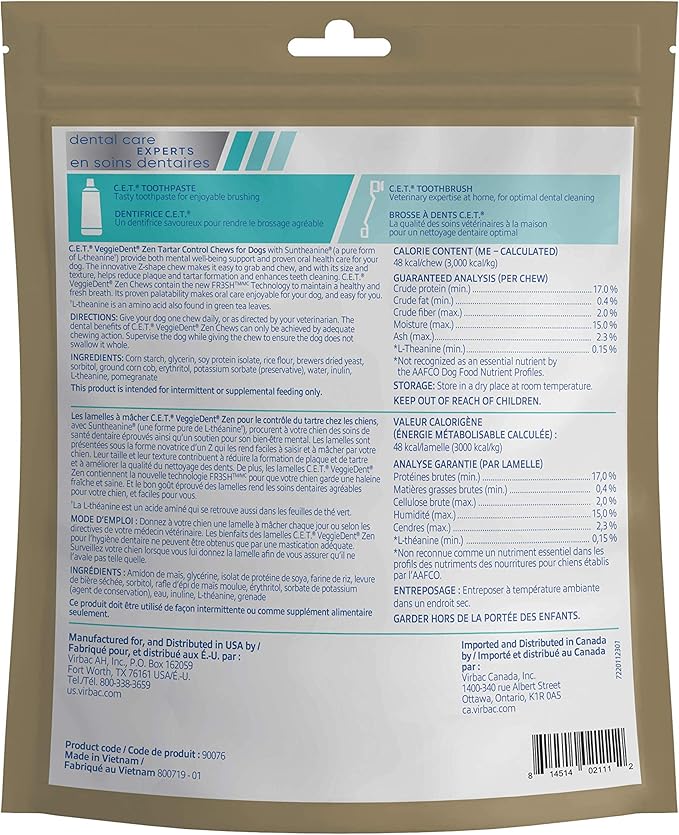 - FORMULATED WITH L-THEANINE: which is also found in green tea L-theanine used in VEGGIEDENT Zen Tartar Control Chews for Dogs comes from Suntheanine, which contains a pure form of L-theanine. Suntheanine is a registered trademark of Taiyo International.