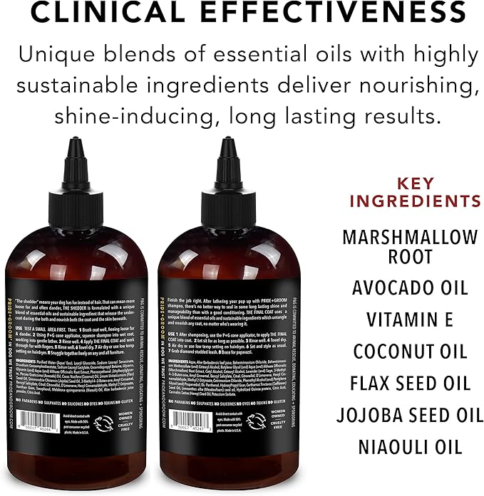 - COATCARE: Each PRIDE+GROOM formula contains unique blend of all-natural essential oils, signature scents and sustainable ingredients for dog’s specific coat + skin types that provide healing, hydrating, cleansing, nourishing and beautifying benefits.