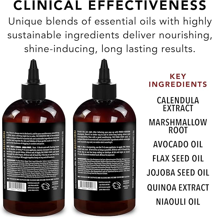 - COATCARE: Each PRIDE+GROOM formula contains unique blend of all-natural essential oils, signature scents and sustainable ingredients for dog’s specific coat + skin types that provide healing, hydrating, cleansing, nourishing and beautifying benefits.