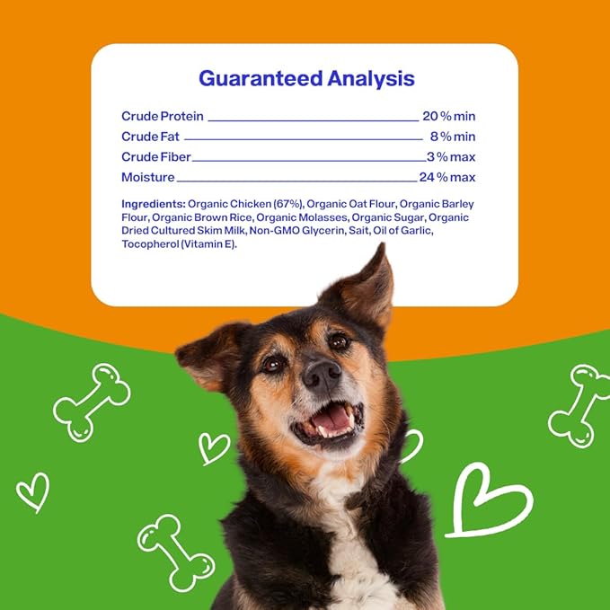 - Organic Chicken, Organic Oat Flour, Organic Barley Flour, Organic Brown Rice, Organic Molasses, Organic Sugar, Organic Dried Cultured Skim Milk, Non-GMO Glycerin, Salt, Oil of Garlic, Tocopherol (Vitamin E)