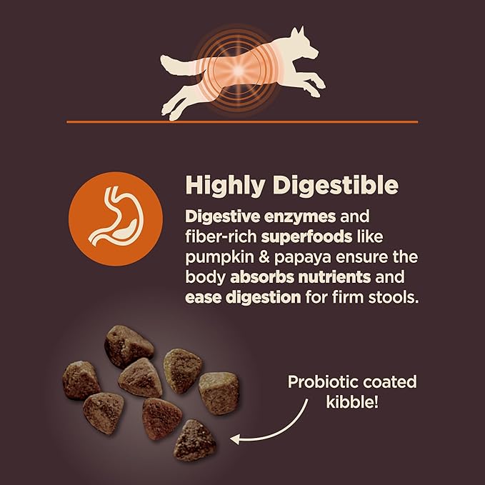 - DIGESTIVE HEALTH ADULT DRY DOG FOOD: This highly digestible, probiotic-coated dog kibble is made with digestive enzymes, a blend of prebiotic fibers, and guaranteed levels of probiotics to support gut health for overall wellbeing and vitality.