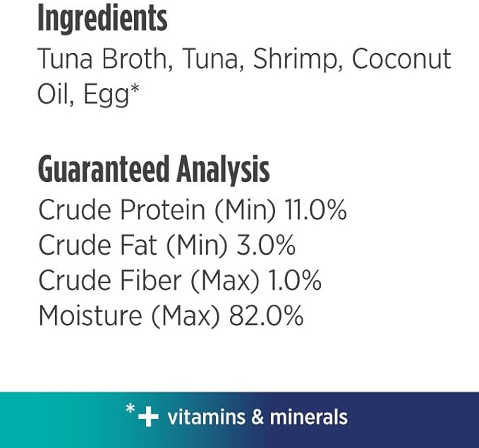 - YELLOWFIN TUNA & SHRIMP RECIPE - Great nutrition has a new texture. Pamper and please your cat with a delicious, nutritious, and satisfying meal. Pack of 24, 2.8 Oz each.