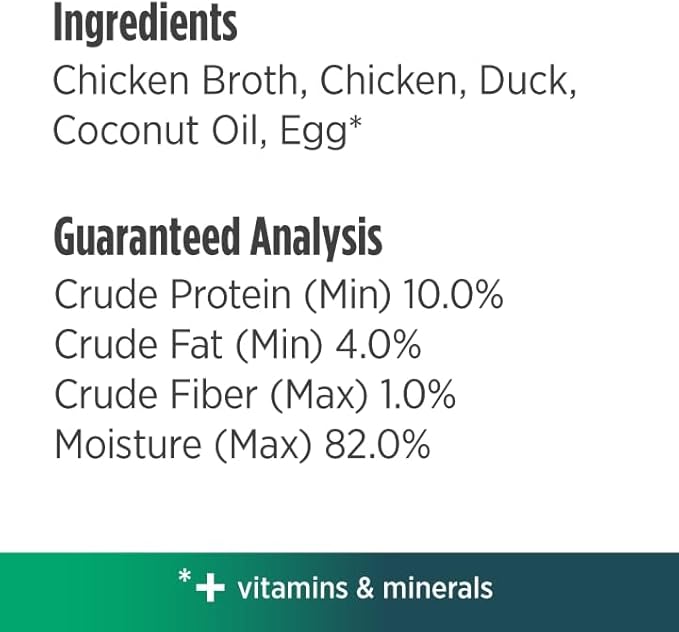 - CHICKEN & DUCK RECIPE - Great nutrition has a new texture. Pamper and please your cat with a delicious, nutritious, and satisfying meal. Pack of 24, 2.8 Oz each.