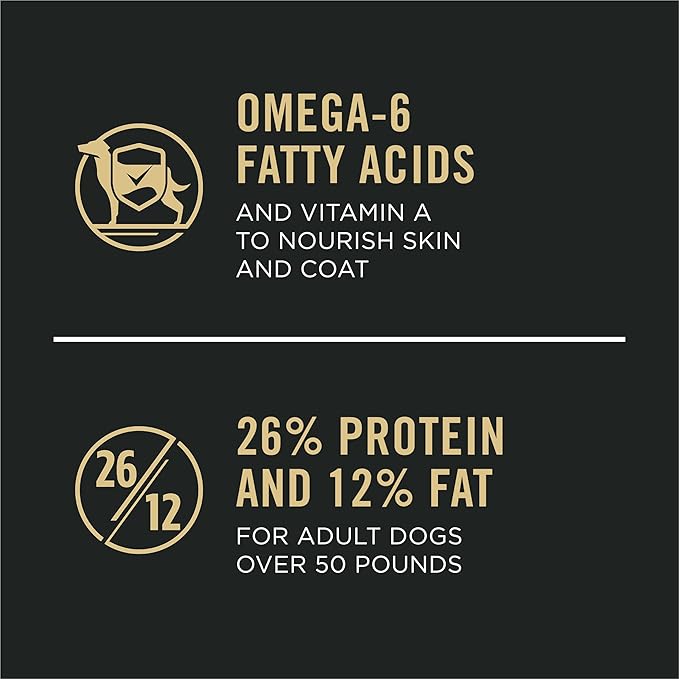 - Purina Pro Plan dry dog food from a veterinarian-recommended brand delivering 100 percent complete and balanced adult dog food nutrition for large breed adult dogs weighing 50 pounds and over
