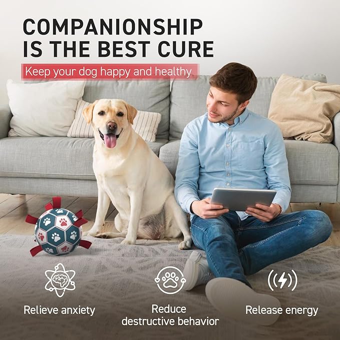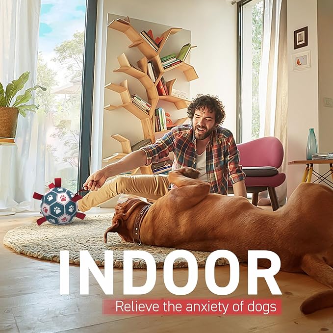 - Upgrade Interactive Dog Toy: Dog soccer ball with nylon tabs sewn evenlyinto the seams not only create an erratic bounce that dogs love to chase, but also make it easier for the dogs to fetch, toss, tug and retrieve. Dog paws areprinted evenly on the dog toys ball to attract dogs attention. There's a longelstrap for people to hold onto the ball, making it a great interactive dog toy to train your dogs