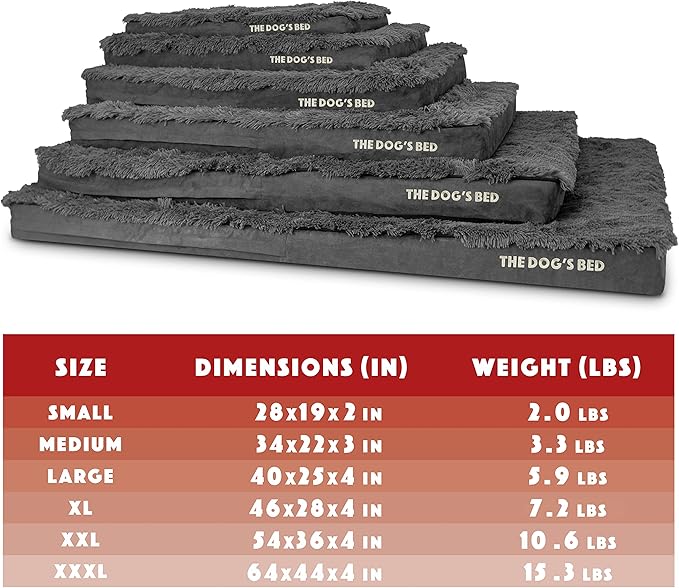 - Large Grey Faux Fur 40x25x4” waterproof orthopedic dog bed. Solid 2” high density, orthopedic memory foam over a solid 2” base of high stability support foam with covers designed so that your bed fits your home decor seamlessly and your dog can stay close to your family