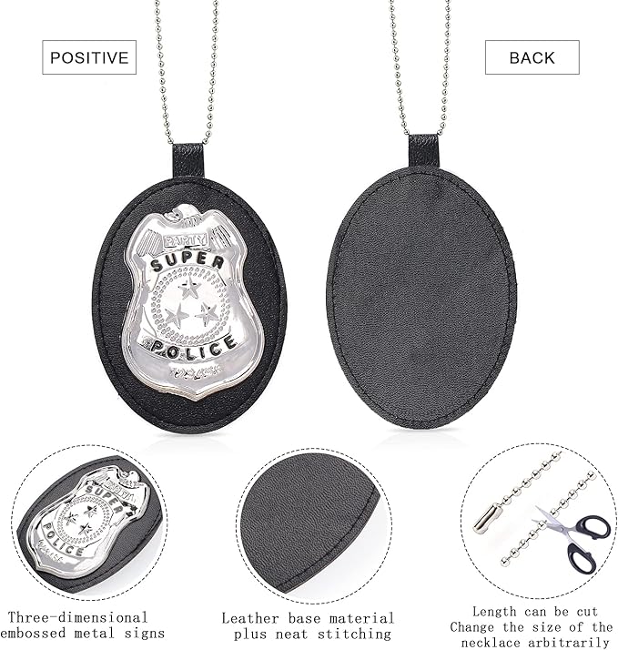 - Police Badge - "Super Police" written which is sewn onto a high quality black faux leather background, badge is attached to a leather mount and a adjustable beaded roller chain, chain 60cm/23.6inch in length, you can cut the required length according to your need