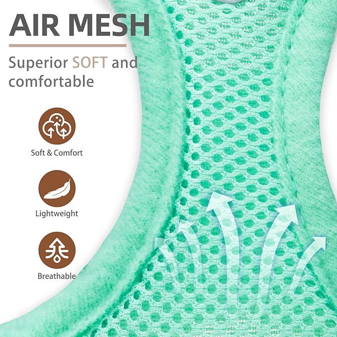 - [COMFORTABLE MATERIAL, DAILY WALKING, FOUR SEASONS WEARING] - The harness is made of durable polyester, and it's adopted with an air-mesh design. The whole harness is very soft, lightweight, and breathable. Even if your dog wears it all day, he won't feel any discomfort. For daily walking or running, it is a very easy thing to do. Besides, this is a four seasons harness, it keeps the dog cool on hot days and keeps the dog warm on cold days.