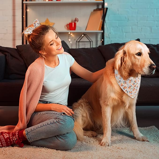 - Matching Bandana and Scrunchie Set - It’s full of love when your pets is wearing the flower bandanas and you are wearing the bow scrunchies. When traveling, sleeping, taking photos or daily warking, adorable spring dog bandana and floral scrunchie is a pretty accessories. The the hair tie can be worn as a wrist accessory and hold your hair. Beautiful dog drool bibs and scrunchie with orange, yellow floral and navy blue leafs pattern, it’s nice photo props.