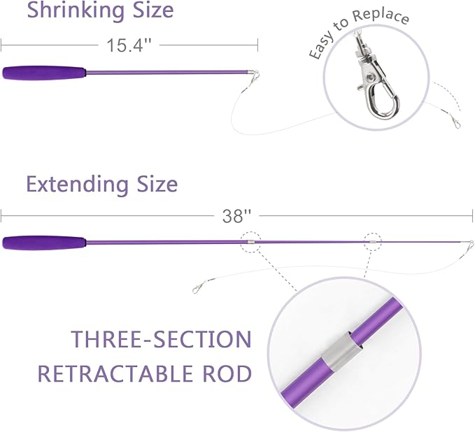 - [Cat Wand Toy] The upgraded version of the wand has higher elasticity and hardness. Comes with a soft and comfortable foam handle. The pole is flexible and retractable, and can be stretched from 15 to 37 inches for easy storage.