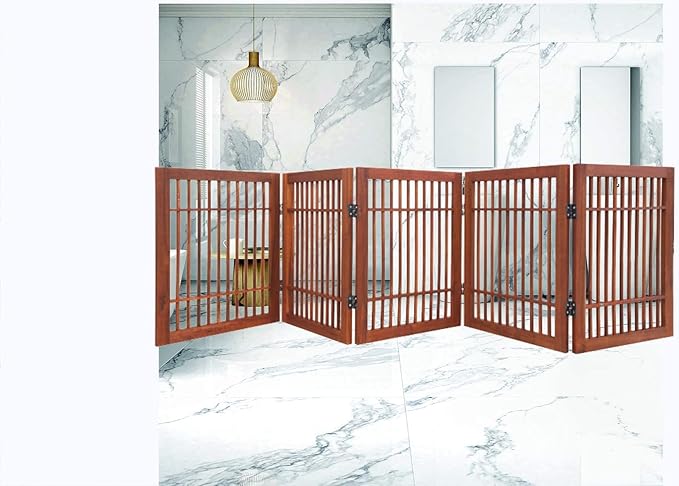 - Our folding pet gates can easily be stored when not being used. Crafted from sturdy acacia wood, this gate offers a secure and practical solution for containing your pets. When unfolded into a wide Z-shape, it stands freely and can be placed in doorways, entryways, halls, bedrooms, or even staircases. Its decorative design adds a touch of elegance to your home while ensuring your dog, puppy, or other pets remain safely confined.