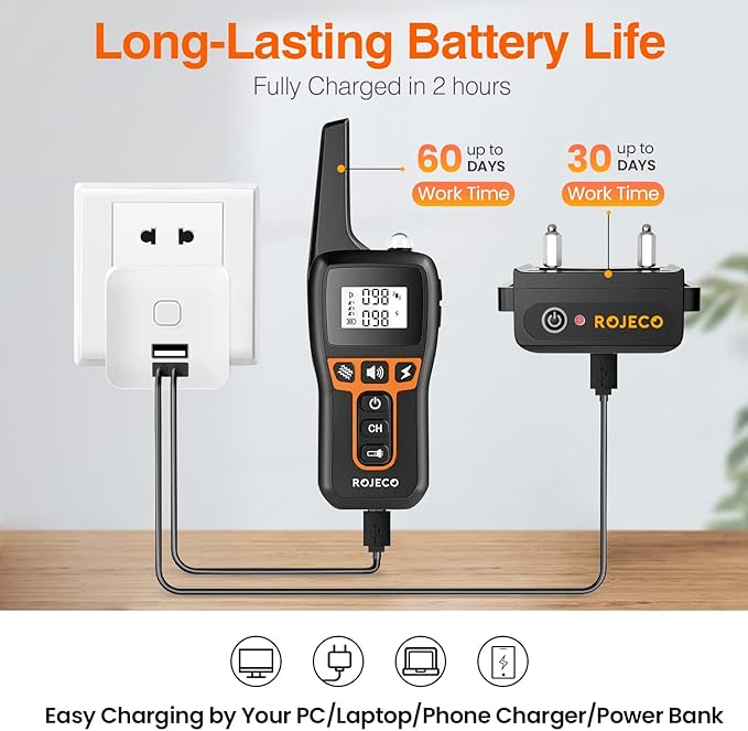 - 【USB Recharged Battery & Long Standby Time】Both bark collar and remote can be fully charged in 2 hours. The max battery capacity of receiver is 650 mAh and can work 30 days. The max battery capacity of remote is 300mAh and can work 60 days