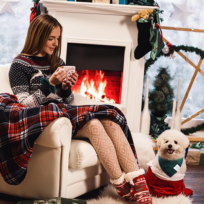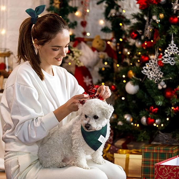E-Clover Christmas Dog Bandanas & Matching Scrunchie Set Plaid Dog Bibs Scarf Boy Triangle Kerchief Bandana for Small Dogs Puppy Birthday Gifts Pet Owner Mom Green Fall