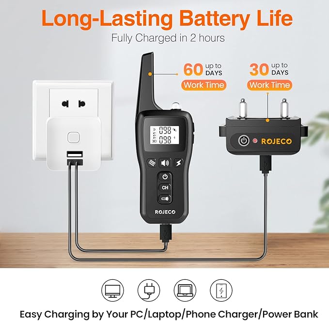 - 【USB Recharged Battery & Long Standby Time】Both bark collar and remote can be fully charged in 2 hours. The max battery capacity of receiver is 650mAh and can work 30 days. The max battery capacity of remote is 300mAh and can work 60 days