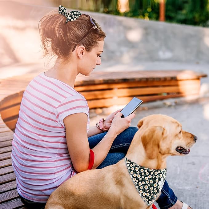 E-Clover Dog Bandanas & Matching Scrunchie Set Girl Dog Scarf Bibs with Bow Scrunchie for Medium Large Dogs Pet Owner Gifts Flower Black