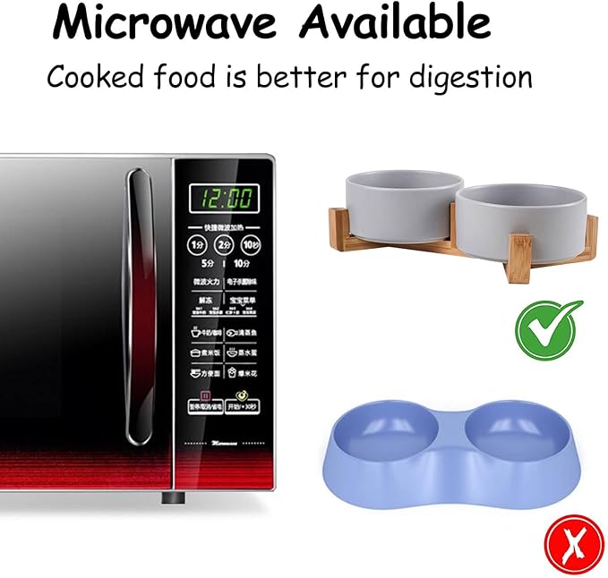 - Double Bowl Design - One bowl for food and one for water for dogs or cats , Each cat dog ceramic bowl has a Unique bamboo stand, raising the dishes closer to your pet for more comfortable eating.