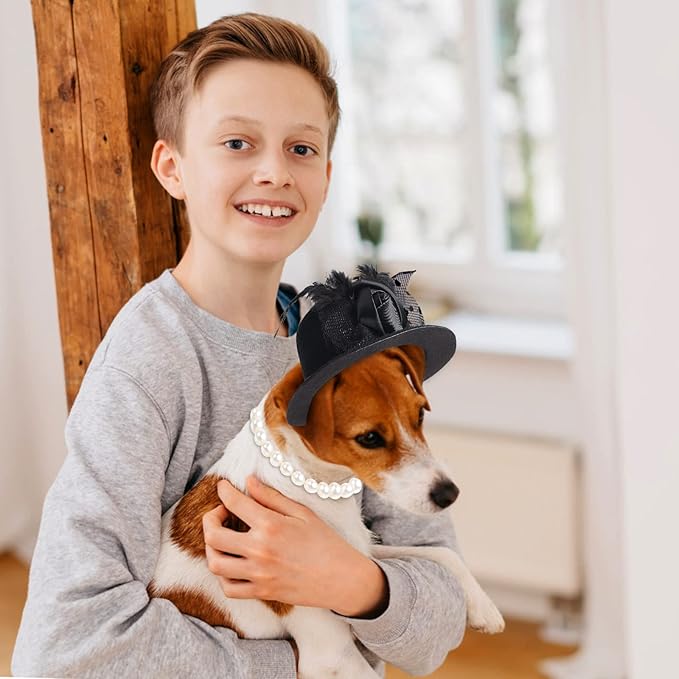 Yewong Formal Top Hat Fascinator Veil Kentucky Derby Hat with Pet Pearl Collar for Christmas Weeding Photo Props Party (Black)