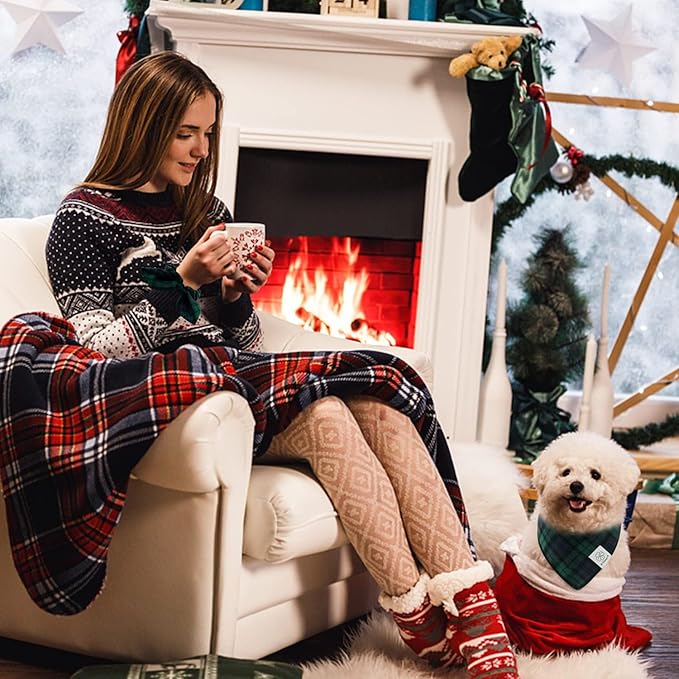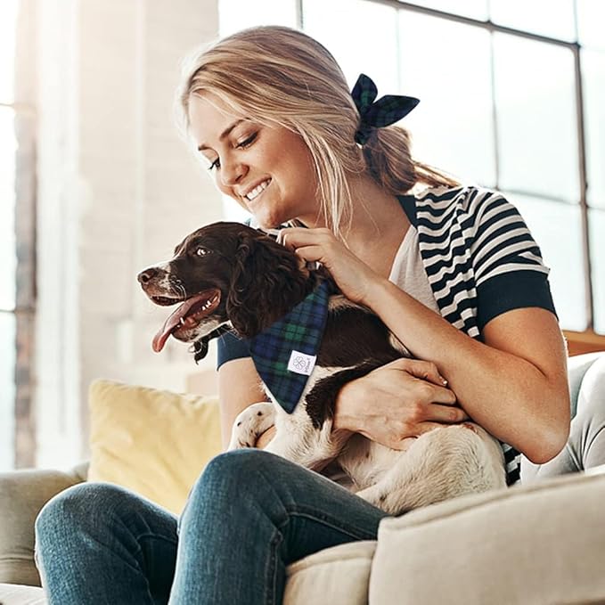 - Matching Bandana and Scrunchie Set- It’s full of love when your pets is wearing the dog scarves and you are wearing the bow scrunchies. When traveling, sleeping, taking photos or daily walking, adorable dog scarf and plaid scrunchie is a pretty accessories. The scrunchie can be worn as a wrist accessory and hold your hair. Beautiful dog drool bibs and bow scrunchie with green and blue tartan pattern, it’s nice photo props for holiday.