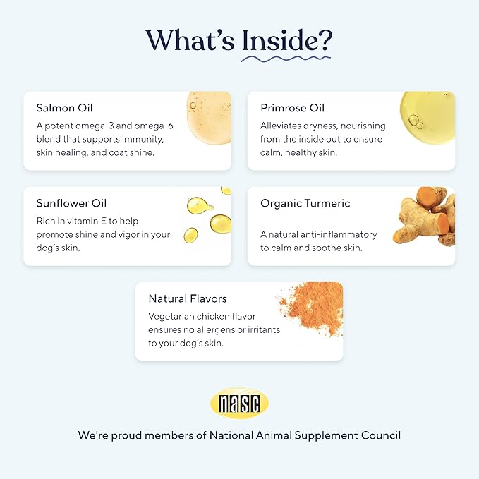 - Boosts Coat Health: Support your dog’s skin and coat with our nutrient-packed chews. Formulated as a skin and coat supplement, these chews promote a shinier, healthier coat while helping to maintain skin hydration and comfort, reducing the chance of occasional dryness and irritation.