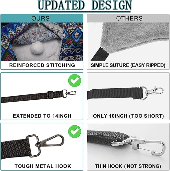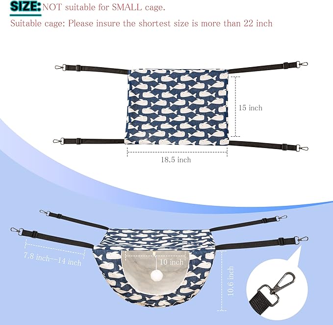 - Exquisite Workmanship & Excellent Stability : We use stronger zinc alloy hooks, which have stronger bearing capacity and can rotate 360°。Reinforced wiring makes the hammock stronger. Exquisite printing process technology, tough metal hooks for better grip, durable stitching technique to combined four straps.NOTE:NOT suitable for SMALL cage. Suitable cage: Please insure the shortest size is more than 22 inch