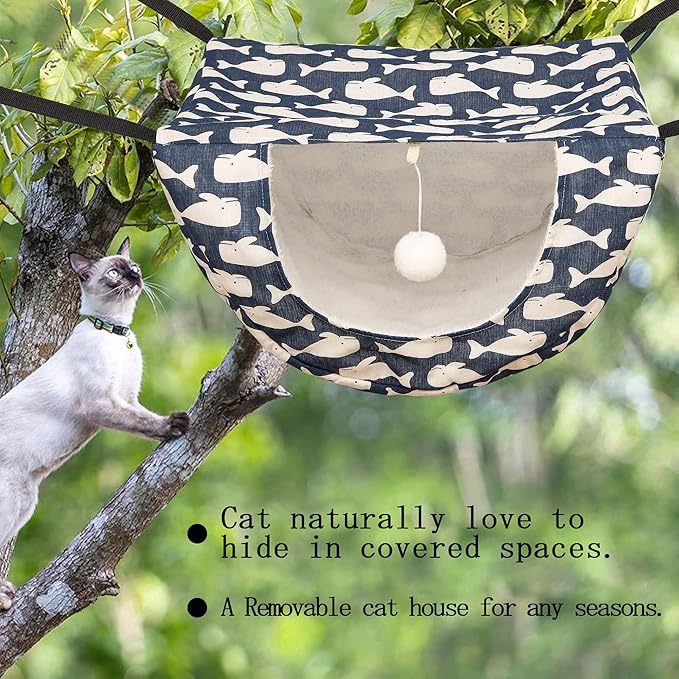 - Upgrade Double-layer Design : Double layer design that accommodate two or more cats to play and rest at the same time. The upper layer of the cat hammock is made of fabric oxford cloth. The inner fleece material is made of faux lambswool.It is suitable for all seasons, providing warm winter and cool summer.The hanging plush ball can increase the cat's interest.No irritation to pet skin; as comfortable as the blankets people use on their own beds