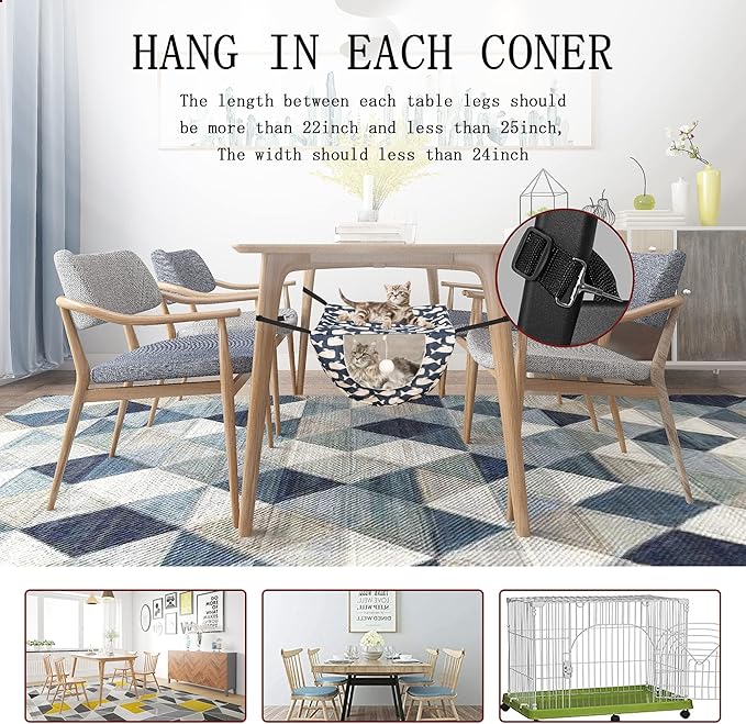 - Multi Occasions Use : Our cat hammock is compatible with cage, table, and chair of different sizes. The adjustable strap could be extended to 14 inches and the stainless steel clips will strongly grab to the cage. It is an ideal product for you to save space. And Cats naturally love to hide in covered spaces