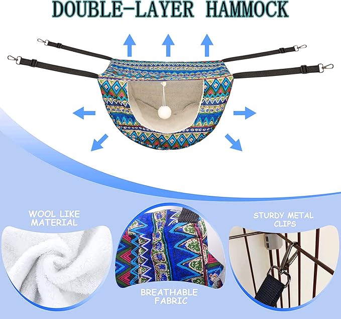 - Exquisite Workmanship & Excellent Stability : We use stronger zinc alloy hooks, which have stronger bearing capacity and can rotate 360°。Reinforced wiring makes the hammock stronger. Exquisite printing process technology, tough metal hooks for better grip, durable stitching technique to combined four straps.NOTE:NOT suitable for SMALL cage. Suitable cage: Please insure the shortest size is more than 22 inch