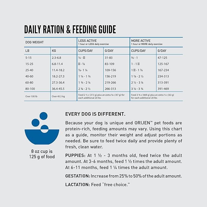 - Dry dog food containing 90 percent* animal ingredients, including ORIJEN WholePrey ingredients like poultry and organs to provide your dog with the most succulent and nutrient-rich parts of the prey