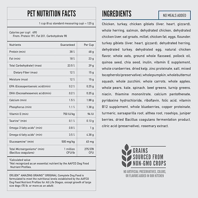 ORIJEN Amazing Grains High Protein Dry Dog Food Original Recipe 4lb Bag