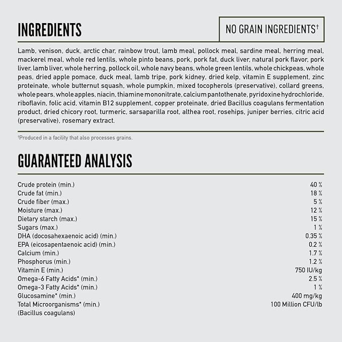 - The first five ingredients are farm-raised lamb, venison, duck, arctic char and rainbow trout to provide your dog with a strong source of protein, vitamins and minerals