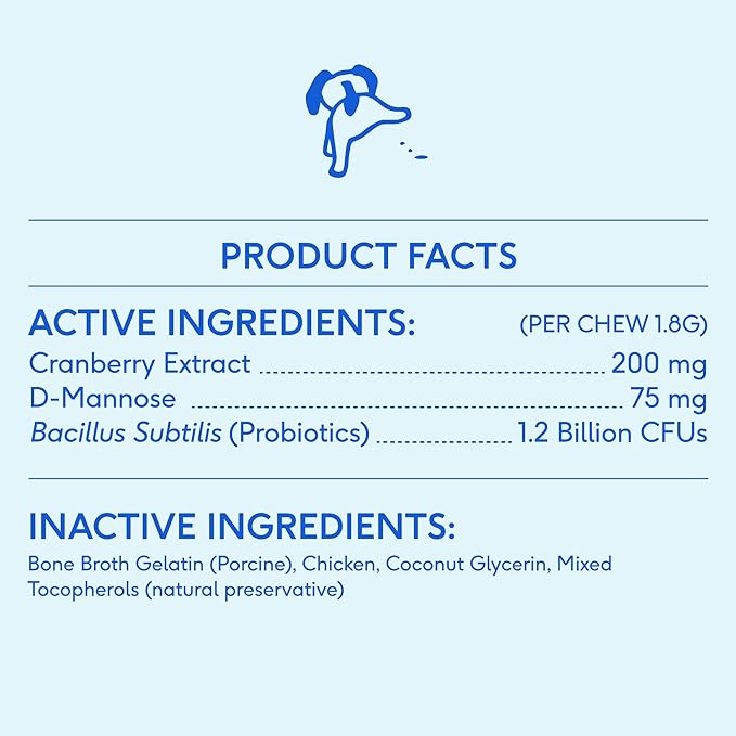 - CLEAN LABEL WITH LESS INACTIVE INGREDIENTS: Our cranberry supplements for dog bladder control use all-natural ingredients like D-Mannose, Cranberry Extract, Probiotics & real chicken, with no added fillers or artificial flavors, to support urinary health naturally.