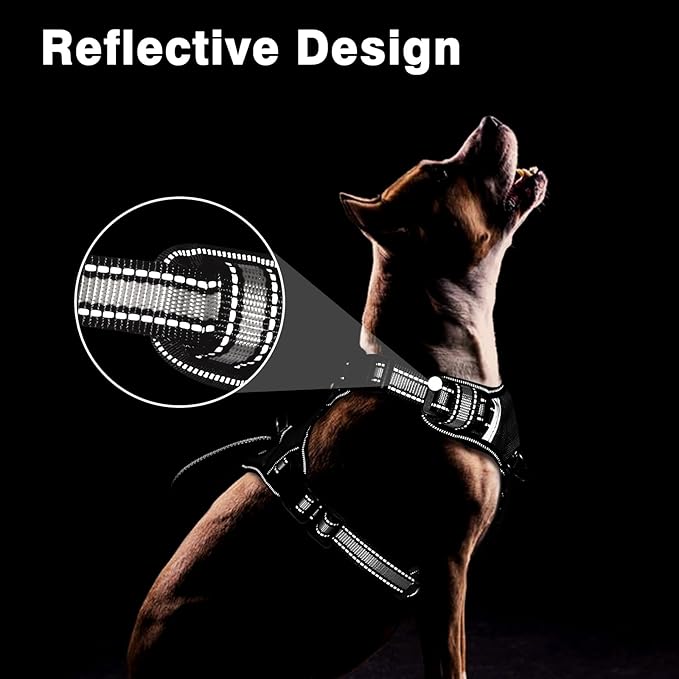 - 【Reflective Nylon】- Higher visibility of the dog training harness allows you and your dog to be seen on early morning or evening strolls. With a Unique Design sturdy handle on the front you can easily and urgently restrain even extra-large dogs. Pulling pressure is evenly distributed to the body to prevent choking.