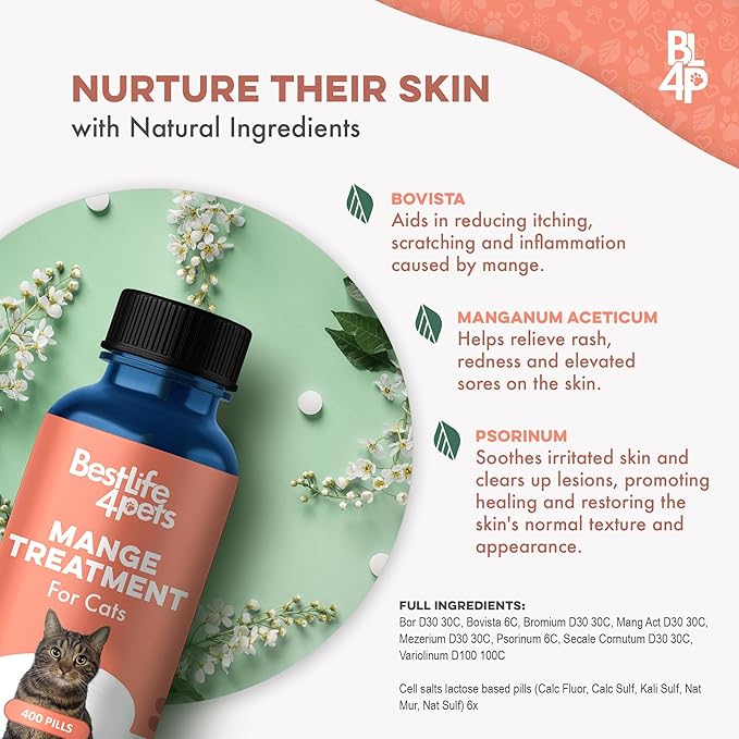 - Soothes Itching & Sores: Our Cat Mange and ear mites support for cats is like a cat first aid kit providing relief for felines struggling with scabs, lesions and crusty skin resulting from ear and skin mites. It not only helps heal the painful welts, but it also provides effective dry skin relief for cats, ensuring a more comfotable life for your cat.