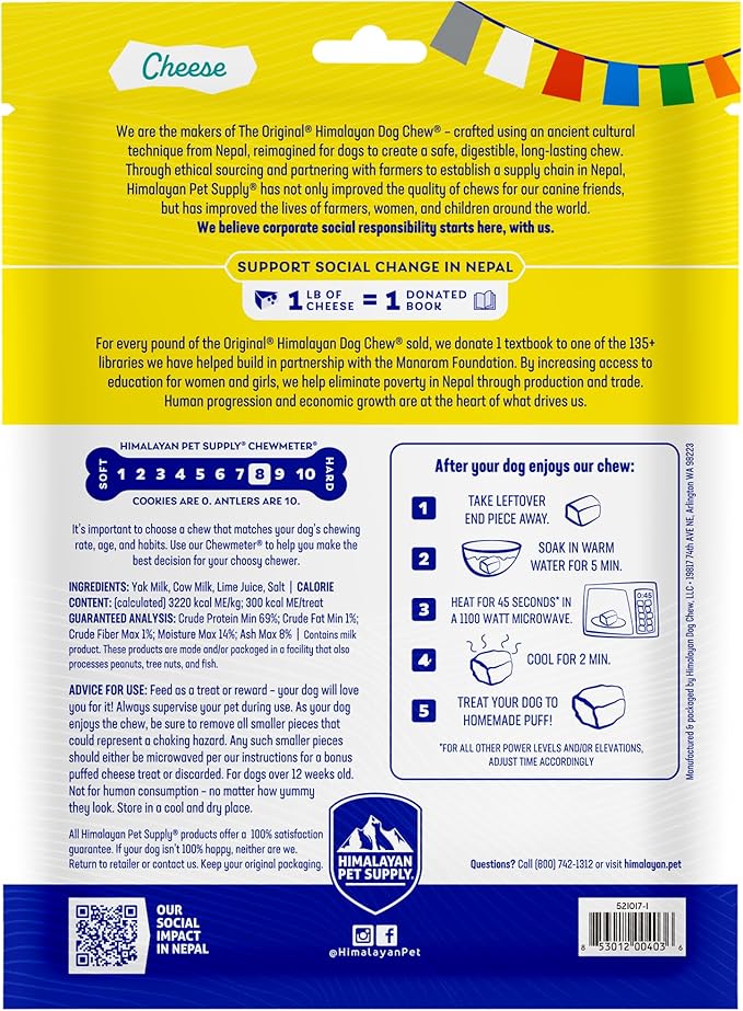 - ORIGINAL CHEESE FLAVOR: Included is a mix of two large & extra large 3.3 oz original cheese flavored Himalayan yak cheese sticks ideal for dogs 65 pounds and smaller, not for dogs younger than 12 weeks.