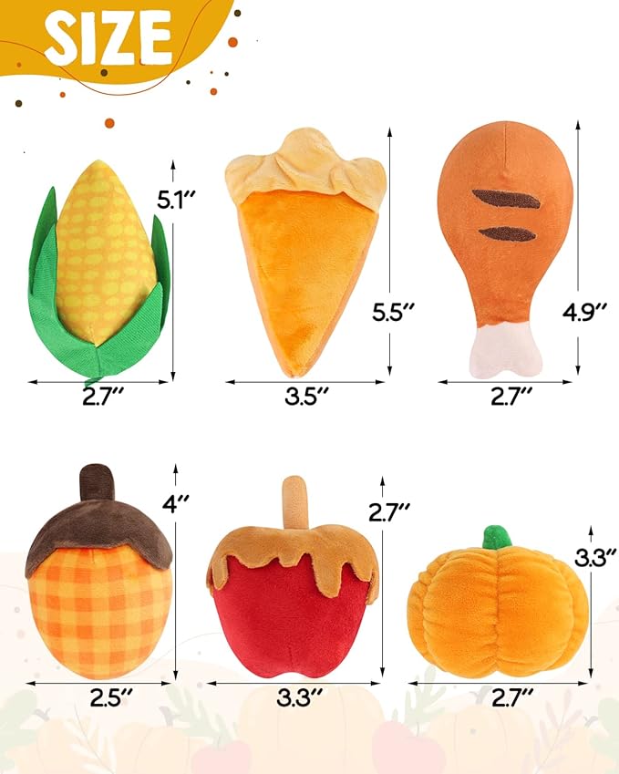 - Thanksgiving Catnip Toys: The package comes with 6 different designs, pumpkin, turkey drumstick, caramel apple, pumpkin pie, corn, and acorn. Give your cat the perfect companion to a wonderful feast.