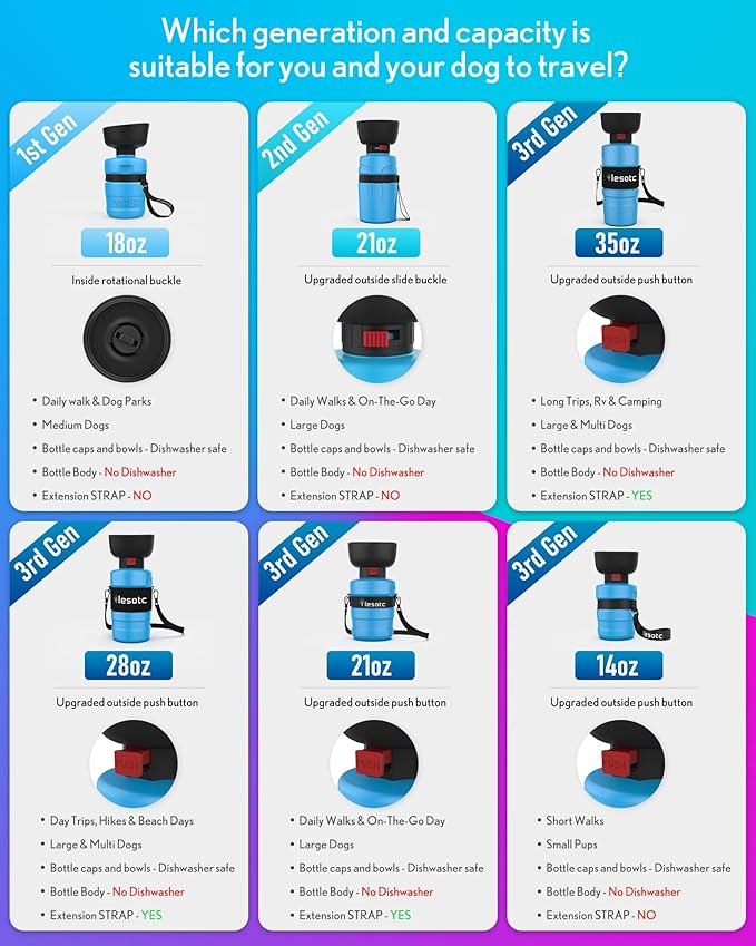 - Mini Capacity: lesotc dog water bottle with a volume of 14oz/400ml. Dog travel water bottle can provide safe, fresh, and healthy water for puppy during long walking, travel, hiking, camping and other outdoor activities. It’s addition to your dog accessories, perfect for dog beach essentials and dog camping essentials