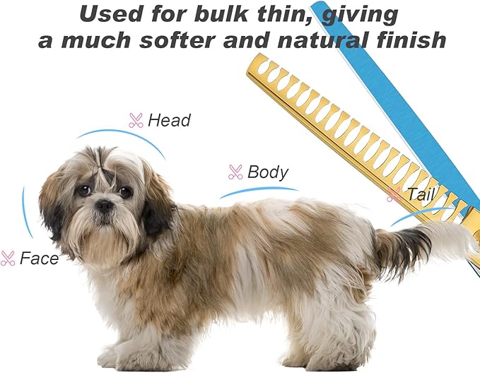 - 【7.0 inch Chunker scissors,70 % thinning rate】The Chunker shears provides an effortless cut through even the coarsest of coats.