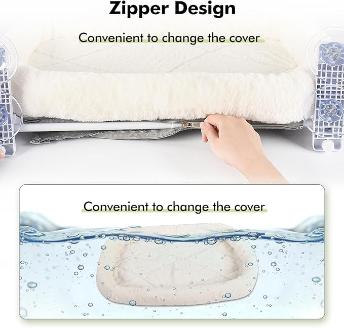 - Comfortable Cushion Bed Cover: This cat window perch is upgraded with thickened fluffy cushion bed cover, which give cats more comfort and safety while sleeping on it. The reverse side is breathable sandwich mesh. You can change the cover at any time by the zipper. Both of them are bite and scratch resistant, with no chemical smell. The cloth cover is also removable for wash.