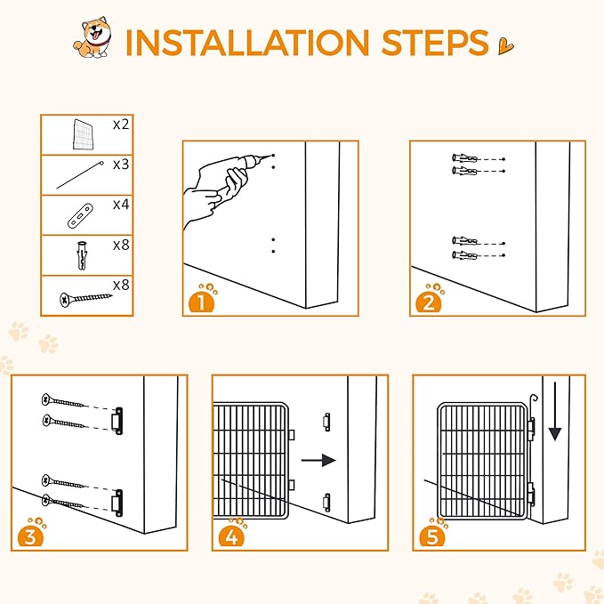- Secured to the Wall: The dog playpen comes with four iron sheets with screw holes and 8 expansion screws, you can pre-set the position of the wall, so that the screws tighten in the hole by rotating, and the fence is firmly fixed to the wall