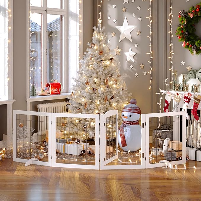 Vantas Folding Pet Gate 96" Wide, 30" Tall No-Assembly Wooden Dog Gate with Door Walk Through, Freestanding Wire Pet Gate, Pet Puppy Safety Fence, with 2PCS Support - White
