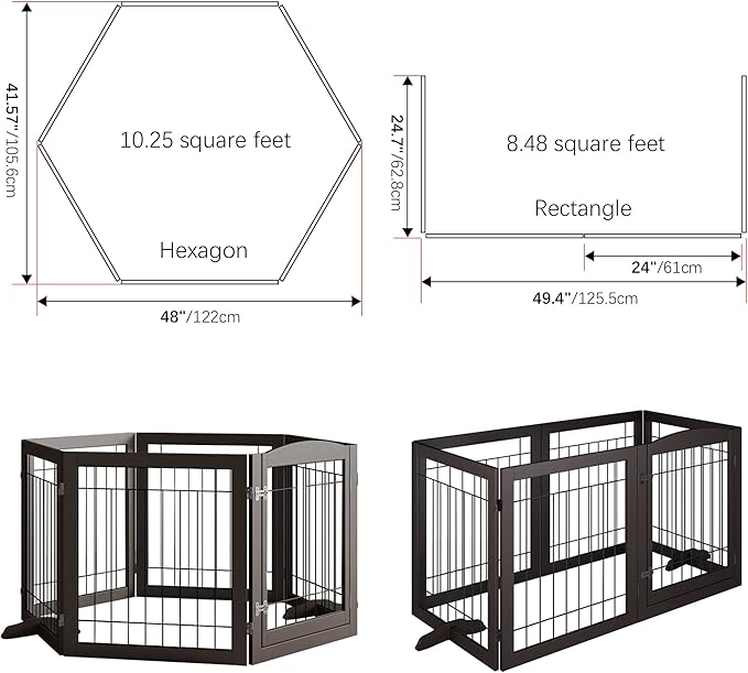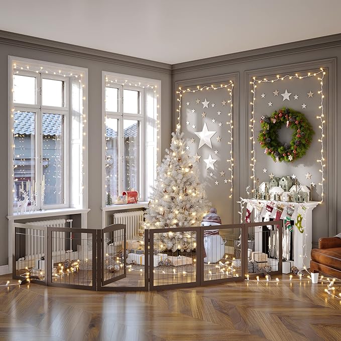 Vantas Folding Pet Gate 144" Wide, 30" Tall No-Assembly Wooden Dog Gate with Door Walk Through, Freestanding Wire Pet Gate, Pet Puppy Safety Fence, with 2PCS Support – Espresso