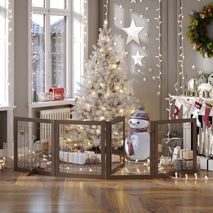 Vantas Folding Pet Gate 96" Wide, 30" Tall No-Assembly Wooden Dog Gate with Door Walk Through, Freestanding Wire Pet Gate, Pet Puppy Safety Fence, with 2PCS Support – Espresso