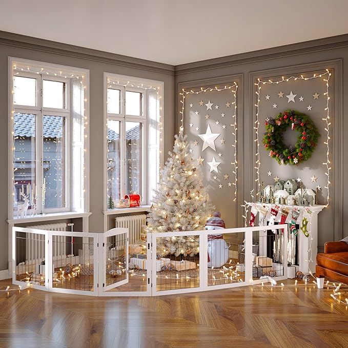Vantas Folding Pet Gate 144" Wide, 30" Tall No-Assembly Wooden Dog Gate with Door Walk Through, Freestanding Wire Pet Gate, Pet Puppy Safety Fence, with 2PCS Support - White