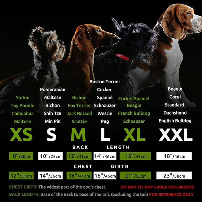 - FOR SMALL DOGS OR CATS. Please priority follows the chest size. Size Large, fits 14" back, 18" chest. Recommended for Spaniel Westie, Pug, Boston Terrier.