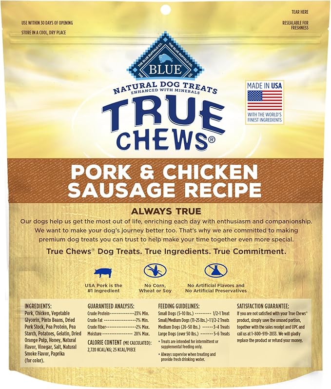 - Contains: One (1) 14-oz bag of BLUE True Chews Natural Chewy Dog Treats; Pork and Chicken Sausage Recipe