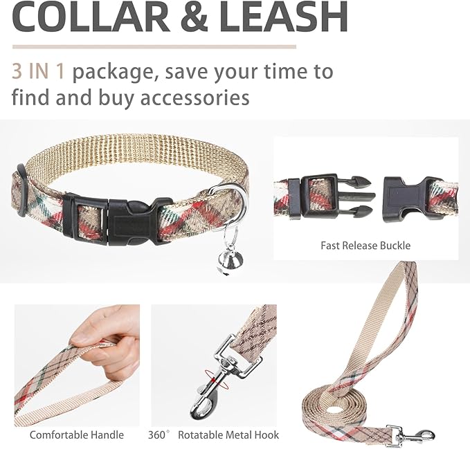 - [DOG HARNESS, COLLAR & LEASH] - The package includes three items, a walking harness, a collar, and a 4.9ft matching leash. The collar is with bell, the leash is equipped with a 360-degree rotation metal hook, and the harness is adopted with a quick-release buckle and double D-rings which are very heavy-duty. You don't need to spend extra time looking through other accessories, but you get all of these items at the same time with less money! So this is a very cost-effective set.