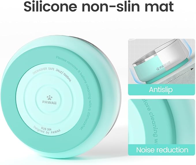 Pawaii Stainless Steel Dog Bowl with Non-Slip Rubber Base & Double Wall Insulation - Durable Design | Includes ID Tag | Dishwasher Safe Food & Water Bowl for All Dogs (34oz)