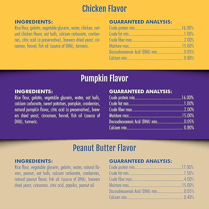 - Variety pack includes a total of 3 bags: 1 Chicken & 1 Pumpkin & 1 Peanut Butter, come try out all the good flavors!