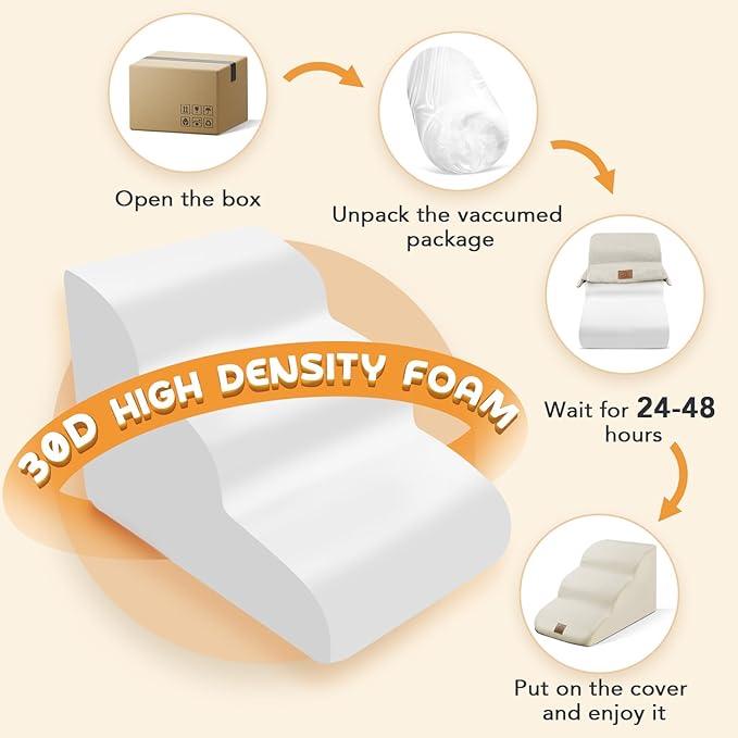 - 【Great Support】The pet stairs is made of 30D high density foam. It can hold up to 60 lbs weight in total. Highly breathable foam base has no odor. It owns the ability of rapid rebound. So don't worry about deformation after pets run. The high-quality coral fleece surface improves the good friction, and the pet will not slip when moving on it.